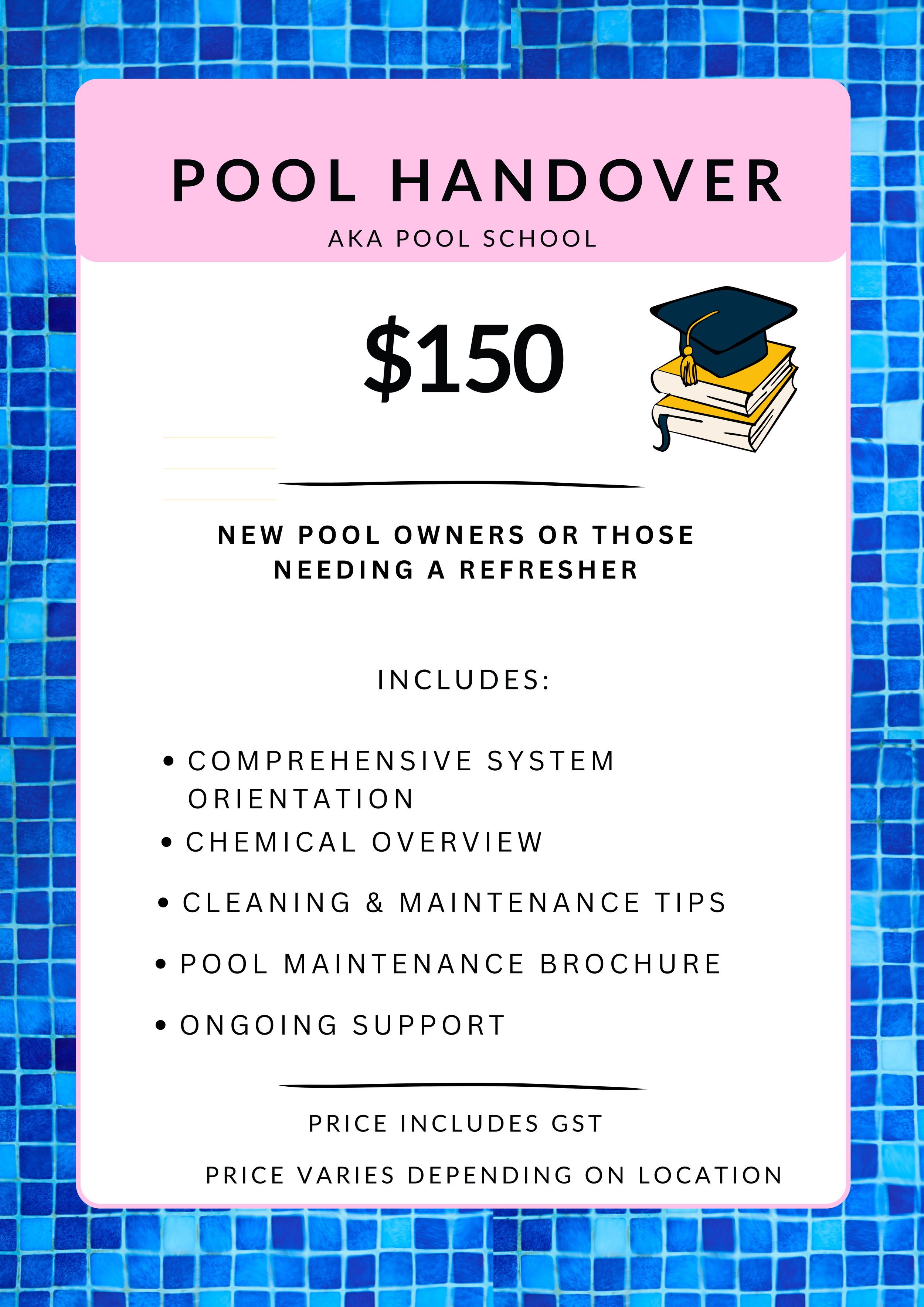 For new pool owners, our pool handover and pool school services teach you how to confidently care for your pool. We also provide diagnostic services, equipment repairs, and equipment replacement to keep your system running smoothly.